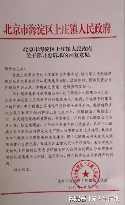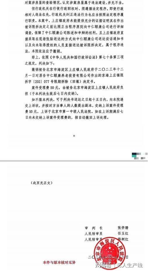 在上庄镇,一处投资近两亿元的养老中心项目,从合法审批到主体竣工,再到遭遇强制拆除,短短数年经历了命运的剧烈起伏。中仁颐康公司遭遇了一场不公正的“风暴”,上庄镇政府官方部门的一系列违法违规的强拆操作,让公司陷入了巨大的困境,损失惨重。尽管此前已得到有关部门关注与受理,但处理意见实在难以让我们信服,存在敷衍行为。在此,我们决定再次发声,将事实公之于众。 1.法院判决铁证如山,镇政府违法行径无可辩驳 此前,海淀区法院已就上庄镇官方针对我司的强拆行为作出明确判决,认定其程序违法,强拆决定理应撤销。这一判决犹如一记重锤,狠狠敲碎了镇政府所谓“合法强拆”的伪装。海淀区法院的权威裁定,是对镇政府肆意践踏法律程序的有力回击,也让我们看到了法律的公正与威严。然而,上庄镇政府官方却对此置若罔闻,依旧我行我素,这种对法律判决的漠视,实在令人愤慨。
