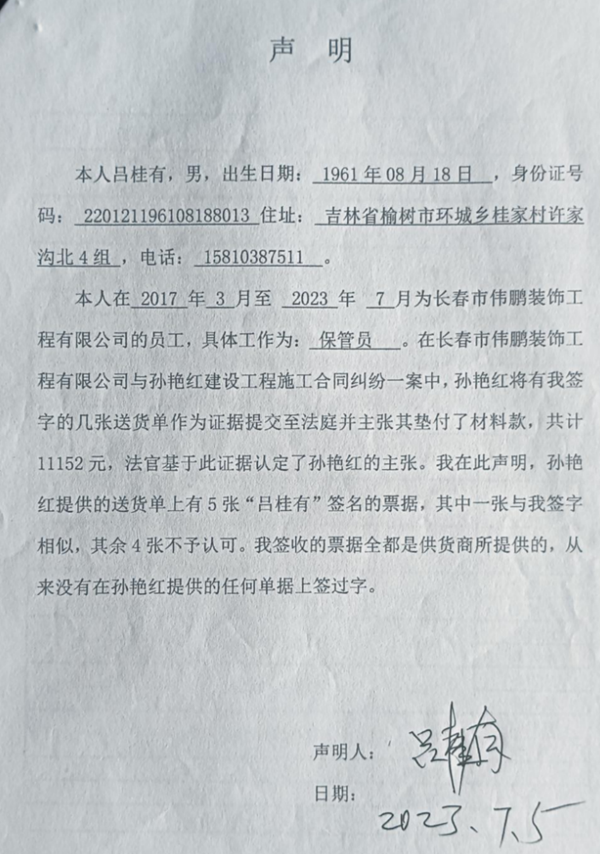 2017年3月,长春市伟鹏装饰工程有限公司与孙艳红签订《建筑装饰装修工程施工合同》,约定由孙艳红以包清工即一包到底的方式承包北京平谷区甘营服装厂装潢改造工程。合同固定总价21万元,并明确了付款节点、工程范围和变更签证程序。然而工程开工不久,双方即陷入争议。伟鹏公司称,孙艳红在工程完成不足50%、已收10.5万元50%进度款的情况下单方面停工撤场,继而通过诉讼主张高额增项工程款和材料垫付费。孙艳红则否认上述指控,主张自身权益。 这场拉锯战从2017年12月孙艳红提起诉讼开始,经历最初的平谷法院拖延审理及上级法院多次审理,伟鹏公司坚持认为,判决中存在多项事实认定与程序违法问题,并于2025年8月起,陆续向中央巡视组、纪委监委等多部门对许友刚、万里红法官的枉法裁判行为进行实名举报。 一、程序与实体的双重争议:从合同价21万到判决价30多万的跳跃 伟鹏公司对生效判决提出多项质疑。首当其冲的是工程款认定问题。合同原定固定总价21万元,法院最终却认定孙艳红已完成工程折价30多万元。公司方面强调,合同明确约定任何增量工程必须经双方现场代表签认,但孙艳红未能提供任何经签字的增项凭证。 在工程质量认定上,判决认为发包人未及时组织验收可推定质量合格。伟鹏公司反驳称,孙艳红单方撤场导致工程烂尾,公司从未使用或接受该工程,依法不能适用“推定合格”规则。“我们根本无法验收,因为工程根本没完工,现场至今无法使用”,伟鹏公司表示。 更令企业难以接受的是垫付材料款的认定。判决支持孙艳红垫付材料款1.1万余元,但公司称合同明确约定包清工、材料由公司提供,从未委托孙艳红代购材料。关键证据中出现的“吕桂有签收材料单”,经该员工本人声明系伪造。公司质疑,法院未进行笔迹鉴定或深入核查,仅以“不排除代买可能性”为由支持该诉求,缺乏证据支持。