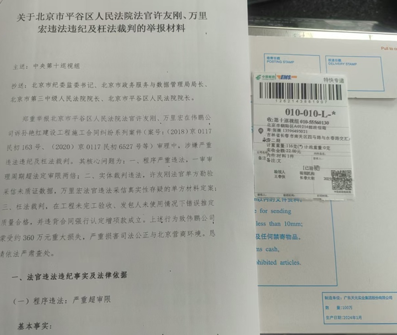 二、法官行为引发强烈质疑:单独勘验11小时、程序是否合法? 2017年12月,孙艳红提起诉讼,案件进入平谷区法院审理阶段。令伟鹏公司不解的是,这本是一起简单的一次性清包合同纠纷,却经历了长达两年的审理过程,远超普通程序6个月的法定审限。 在一审过程中,法官许友刚涉嫌帮助孙艳红,曾单独前往工地测量11小时,并无具备资质单位在场,然后将数据交孙艳红制作《工程概预算书》,作为认定工程量的关键依据。伟鹏公司指出,该勘验未有第三具备资质的鉴定机构到场,笔录未经质证,涉嫌违反《中华人民共和国民事诉讼法》及证据规定。 “许友刚法官单独调查、单方交付数据、未经质证直接作为定案依据,这在程序上存在重大瑕疵”,一位不愿具名的民事诉讼法学者表示,“程序正义是实体正义的保障。法官现场勘验必须严格遵守程序规定,保障双方当事人的诉讼权利。任何取证的瑕疵都可能影响证据的证明力。” 三、举报与回应:法院被指“混淆举报性质”,沟通陷入僵局 2025年8月9日,伟鹏公司正式向中央第十巡视组、北京市纪委监委等多部门邮寄举报材料,指控平谷区法院法官许友刚、万里宏在审理中涉嫌程序违法、证据采信失当、枉法裁判。 8月14日,平谷法院工作人员来电告知收到给他们邮寄的举报材料,并告知“案件已申诉,需走抗诉程序”,被伟鹏公司批评为“混淆法官违纪举报与案件程序问题”。在其要求书面回复时,沟通中断,电话再无回应。 8月17日,伟鹏公司再次致信平谷法院院长,请求区分司法程序与法官个人行为调查,并恳请正式书面回应,至今未果。 8月25日,北京市信访办短信告知,举报材料已转交北京市高级法院办理。但截至目前,伟鹏公司未收到任何实质答复或处理进展。 8月29日,伟鹏公司收到01089966602来电,告知中央巡视组转的材料已经收到,自称姓李,系民一庭法官,当问其姓名时候,即挂断电话。