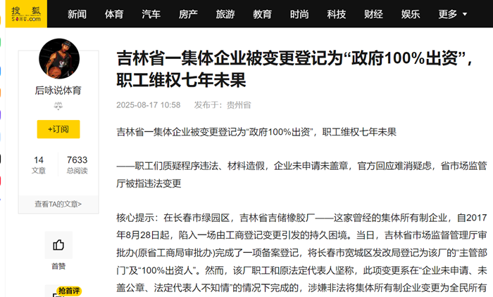 吉林省一集体企业被变更登记为“政府100%出资”,职工维权七年未果 ——职工们质疑程序违法、材料造假,企业未申请未盖章,官方回应难消疑虑,省市场监管厅被指违法变更 核心提示:在长春市绿园区,吉林省吉储橡胶厂——这家曾经的集体所有制企业,自2017年8月28日起,陷入一场由工商登记变更引发的持久困境。当日,吉林省市场监督管理厅审批办(原省工商局审批办)完成了一项备案登记,将长春市宽城区发改局登记为该厂的“主管部门”及“100%出资人”。然而,该厂职工和原法定代表人坚称,此项变更系在“企业未申请、未盖公章、法定代表人不知情”的情况下完成的,涉嫌非法将集体所有制企业变更为全民所有制。 此举导致企业性质陷入混乱:住所地在绿园区,登记主管部门却在宽城区;本为集体企业,登记却显示为政府机关100%控股;更令人费解的是,该厂2005年营业执照已被吊销,却在2017年通过此变更后重新获得新版营业执照。七年来,橡胶厂职工持续维权,指称集体企业遭到非法变更,集体企业性质被更改,橡胶厂职工权益严重受损,而省市场监管厅的后续处理被指推诿与失当。